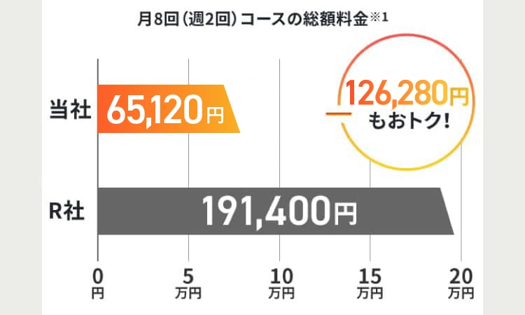 月2回コース:19,000円 ▶1回あたり9,500円 月4回コース:36,000円 ▶1回あたり9,000円 月8回コース:68,000円 ▶1回あたり8,500円